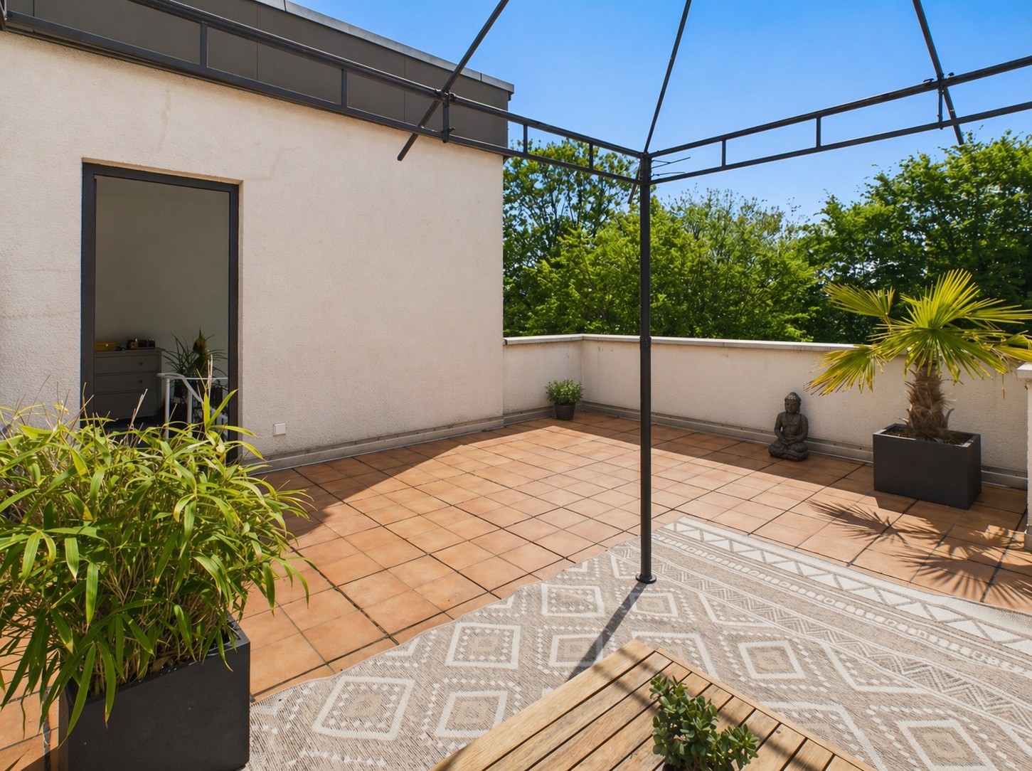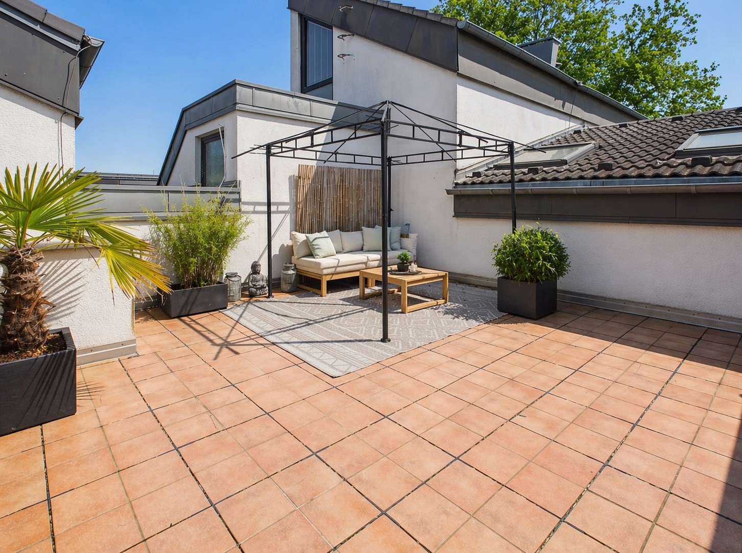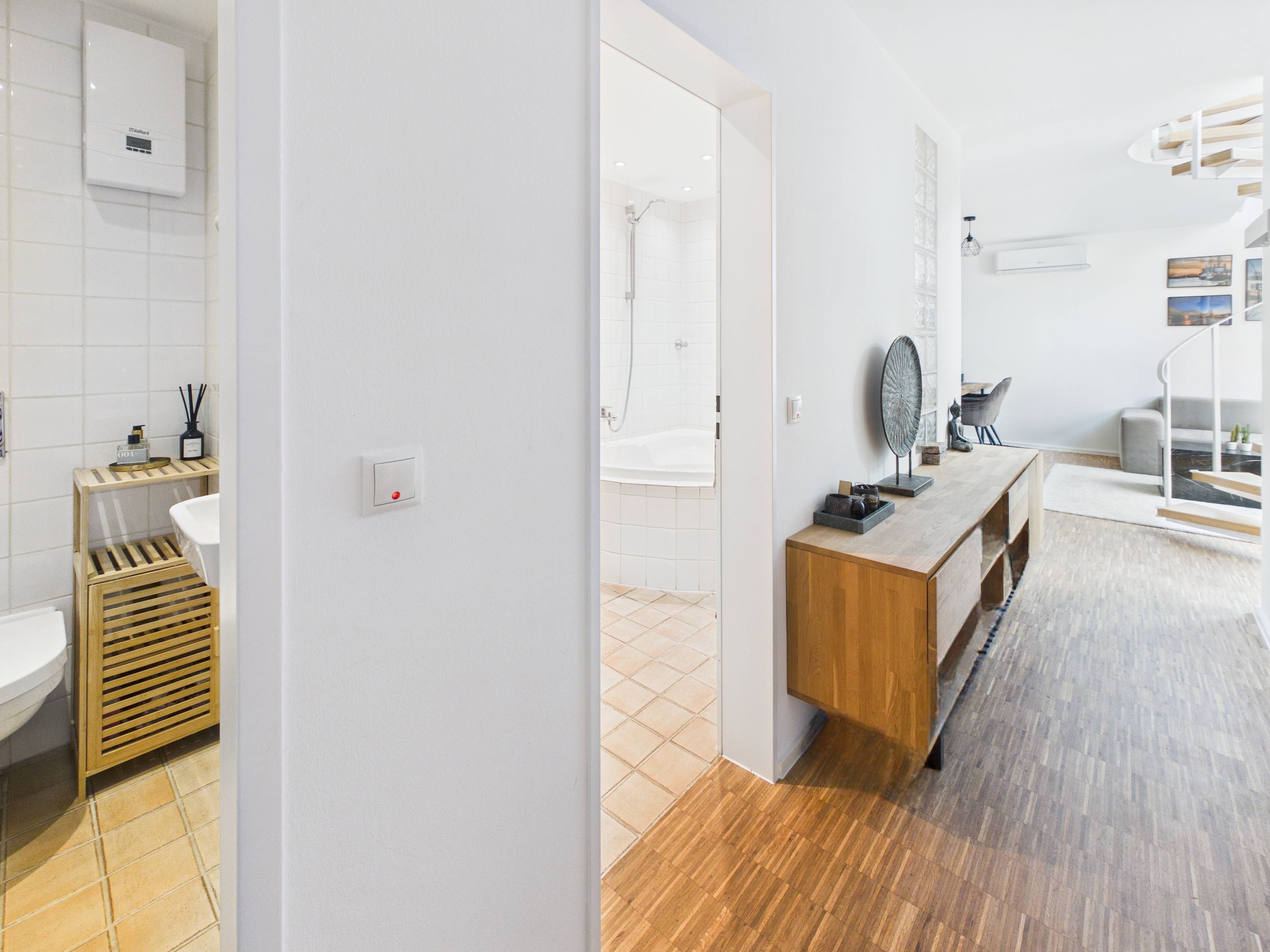 Das zweite Wohnhighlight bildet das klimatisierte Dachgeschoss, welches ebenfalls mit seiner Helligkeit und Offenheit ein modernes Wohngefühl vermittelt. Von hier aus haben Sie Zugang zur ca. 29 m² großen Dachterrasse (zu 50% in der Wohnflächenberechnung berücksichtigt), welche ganztägig viele Momente in der Sonne und eine beruhigende Aussicht in die Natur garantiert.